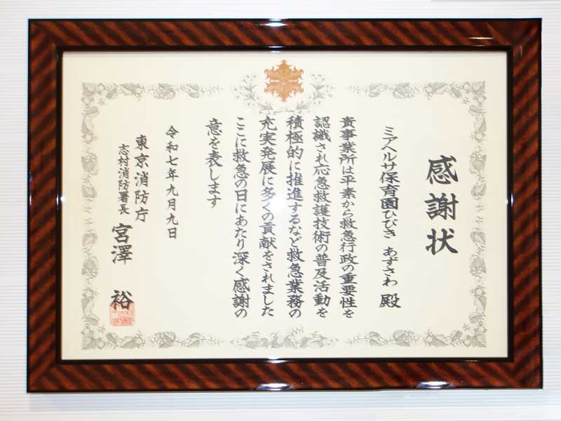 保育 2025年10月02日 ミアヘルサ保育園ひびきあずさわは、救急行政の重要性を認識し、応急救護技術の普及活動を積極的に推進するなど救急業務の発展に貢献したとして、東京消防庁志村消防署より感謝状が贈呈されました。