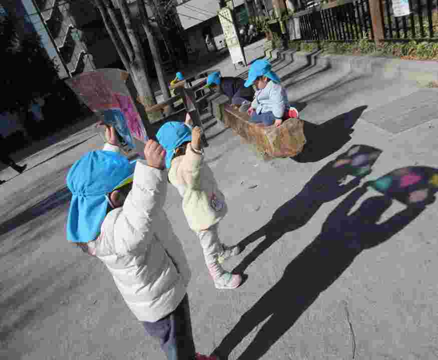 ・活動中の子ども達の姿・・・公園では自然の光から生まれる影や自分たちの影を発見し、影を踏んだり触れてみたり
