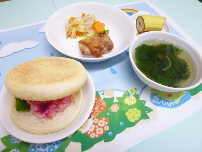 初登場のイングリッシュマフィンにはポテトサラダをのせて紫陽花を作りました
