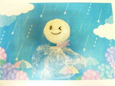 おやつは、ラップおにぎりでてるてる坊主を♪