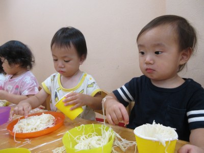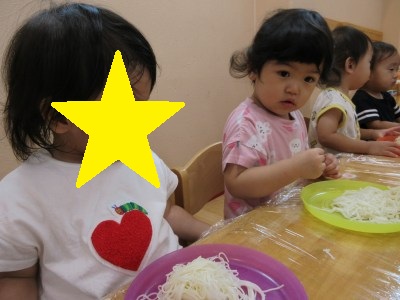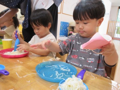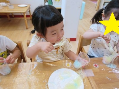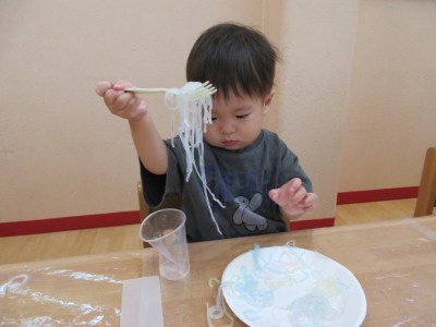 小麦粉、片栗粉、寒天などで遊んだのですが、特に盛り上がったのが、そうめんや糸こんにゃくです。
