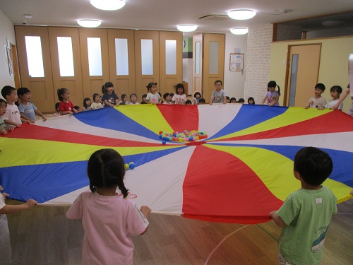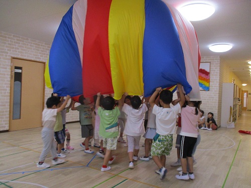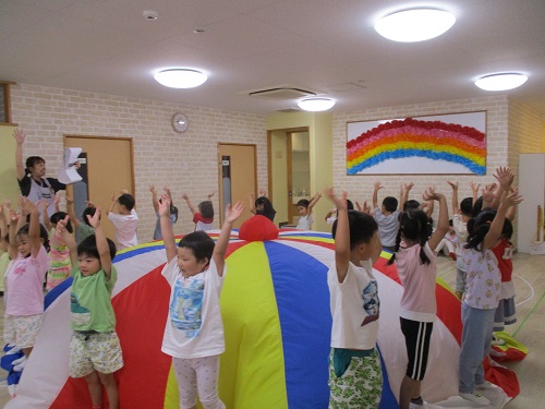 RPGの曲に合わせて、技を成功させるにはどうすればいいか子どもたちと話し合い、「この歌詞が出てきたら動こう!」とパラバルーンを動かすタイミングを皆で決めました。歌詞をよく聞き、「ロケットの次は王冠!」と技の流れも覚え、綺麗に決まると近くにいる友だちと喜び合う姿が見られました。