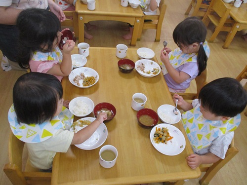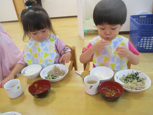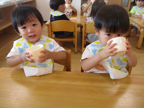 飲み方やコップの持ち方を覚えていけるように引き続き声を掛けていきます。