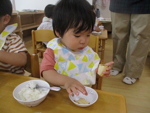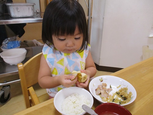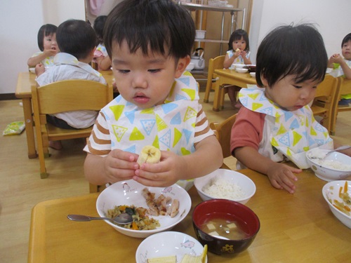 バナナが出るたびに「皮はむくんだよ」と保育者が見本を見せて伝えていくことで、