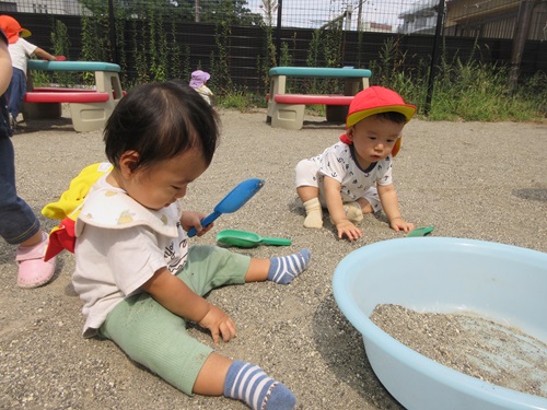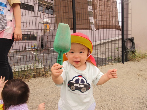 玩具のスコップを手に取り砂をすくったりすることを楽しんでいます。