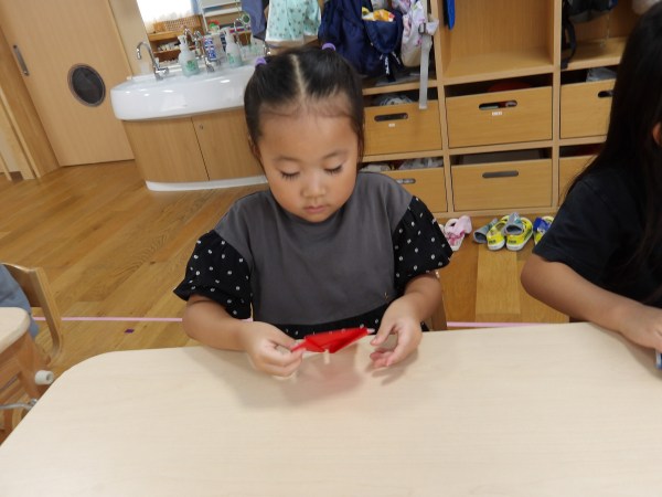 「運動会がんばるぞー!」と気持ちを込めながら真剣に折る子どもたち・・・