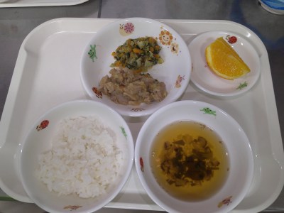 ごはん、豚肉とおいもの甘辛炒め、青菜の中華和え、わかめスープ、オレンジです。