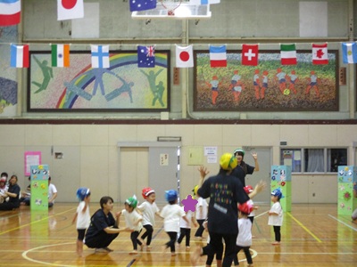 ひよこ組、こあら組は保護者の方と一緒に障害物競争と体操を楽しみました。