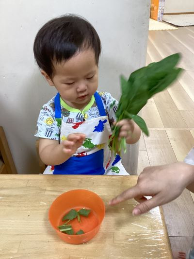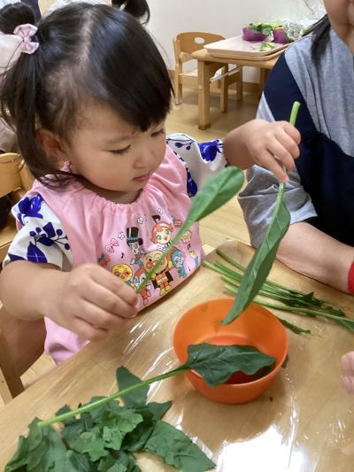 乳児クラスのお友達は9月の食育で『ほうれん草ちぎり』を行いました。