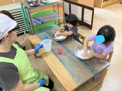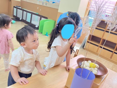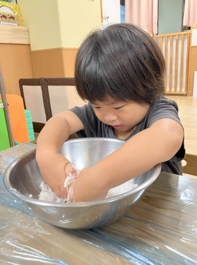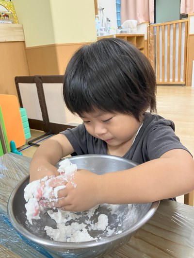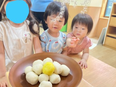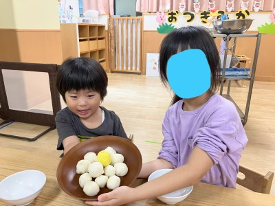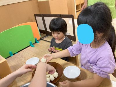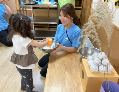 未満児クラスは「だんご粉」をカップからボールに移すお手伝い♡