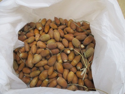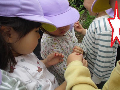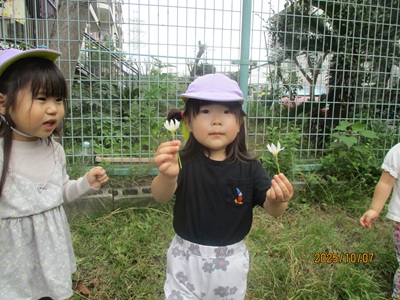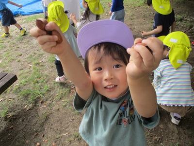 「じゃーん!」保育者に見つけた自然物を披露する姿が見られました。