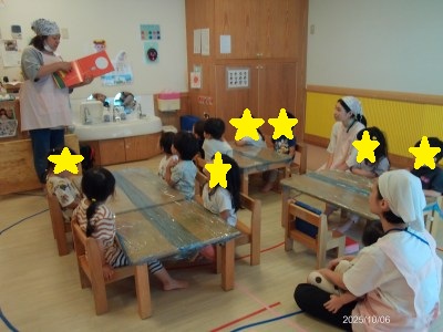 活動の前に、まずは【おつきみバス】という絵本をみんなで読みました。