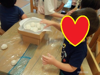 この日のために、日ごろから保育活動の中で粘土をコロコロと形を丸くする練習をしてきました。