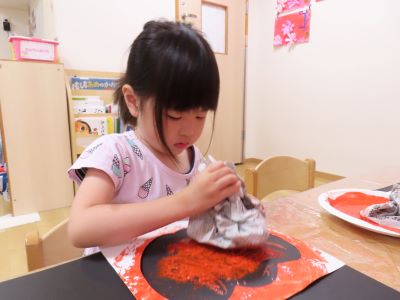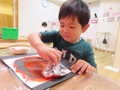 ジャックオランタン型に切り取った中に、絵の具をつけた新聞紙でポンポンスタンプをしていきました。