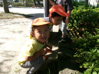 「大きい葉っぱだ!」「赤い色だ!」等、大きさや色の違いを楽しみながら探索活動を行いました。