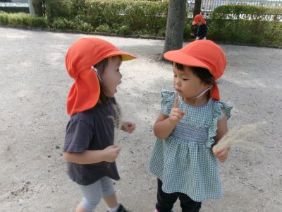 公園では大きな葉っぱに興味津々の子どもたち♪