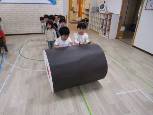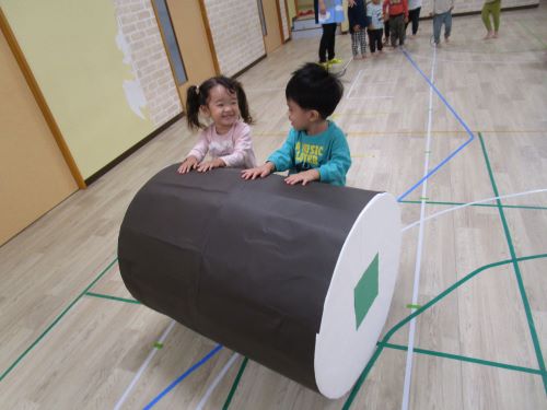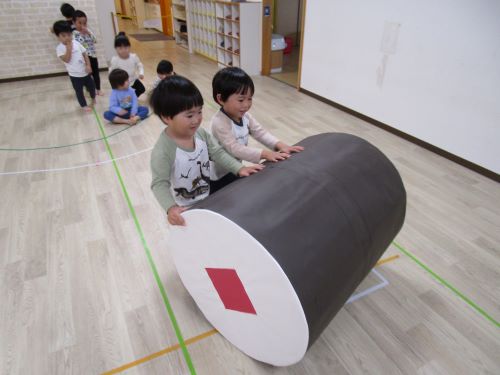 当日は親子競技で行いました。運動会ごっこでは友だちと2人組になり転がしました。