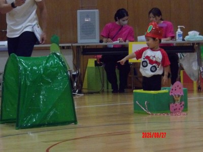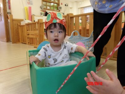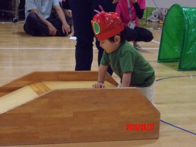 『はばたけ!はらぺこあおむしたちの大冒険』という競技名で、はらぺこあおむしになりきった子どもたちが、保護者の方が引っ張ってくれるダンボールカーに乗ったり、トンネルをくぐったり、すべり台をしたりして大冒険をし、最後は蝶々の羽をつけて保護者の方に持ち上げてもらってはばたいてゴールしました!