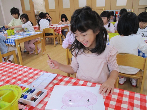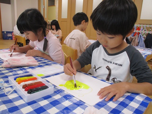 お面作りでは図鑑や写真を見ながらクレヨンで絵を描き、絵の具で色を塗りました。