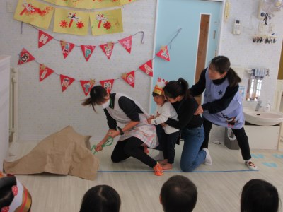 次々お友だちを呼んで引っ張り、見ているお友だちも「うんとこしょ!どっこいしょ!」と大きな声で頑張ります‼