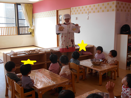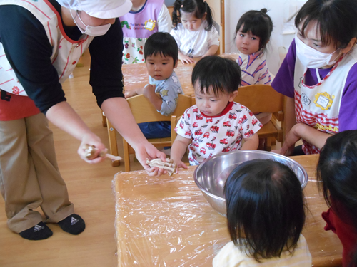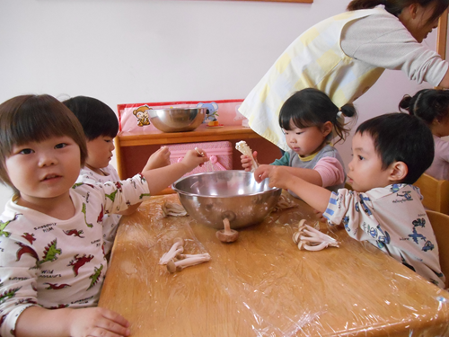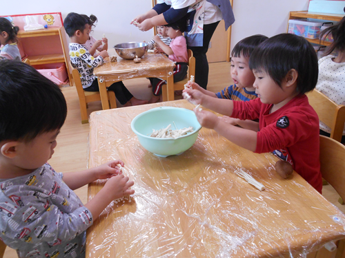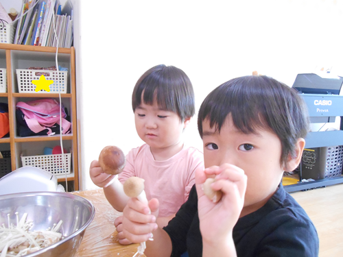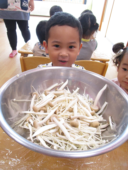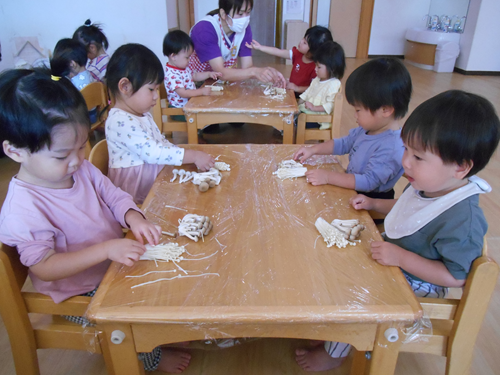 今日は、はな組・つき組で「きのこほぐし」を行いました。