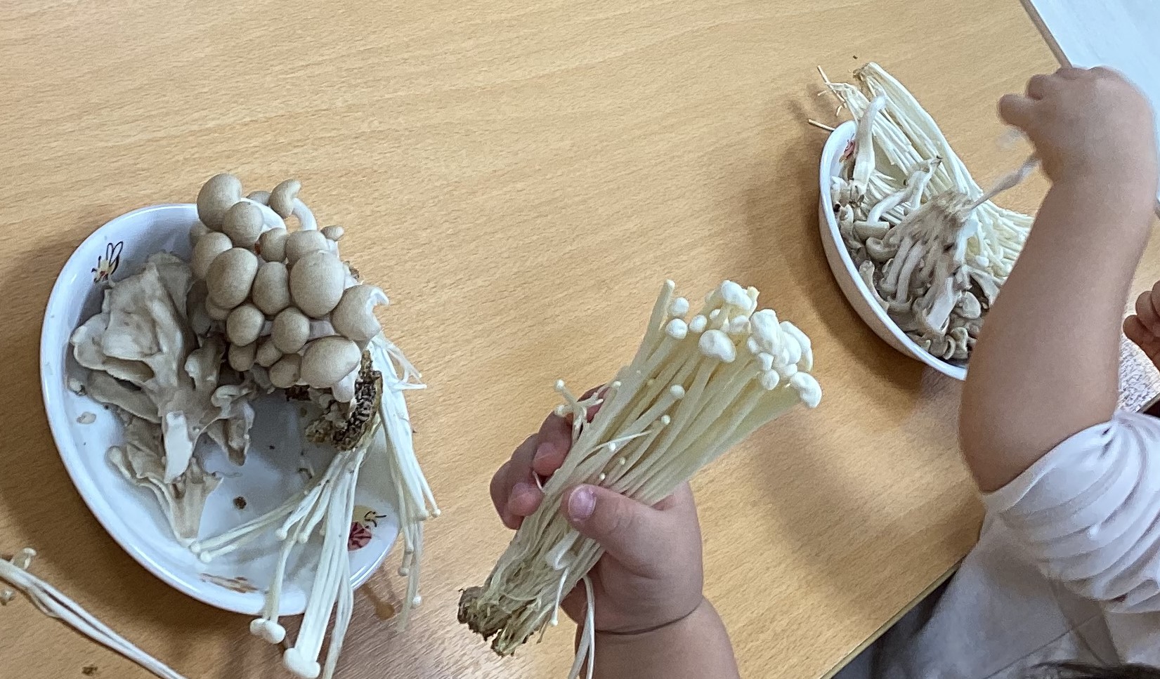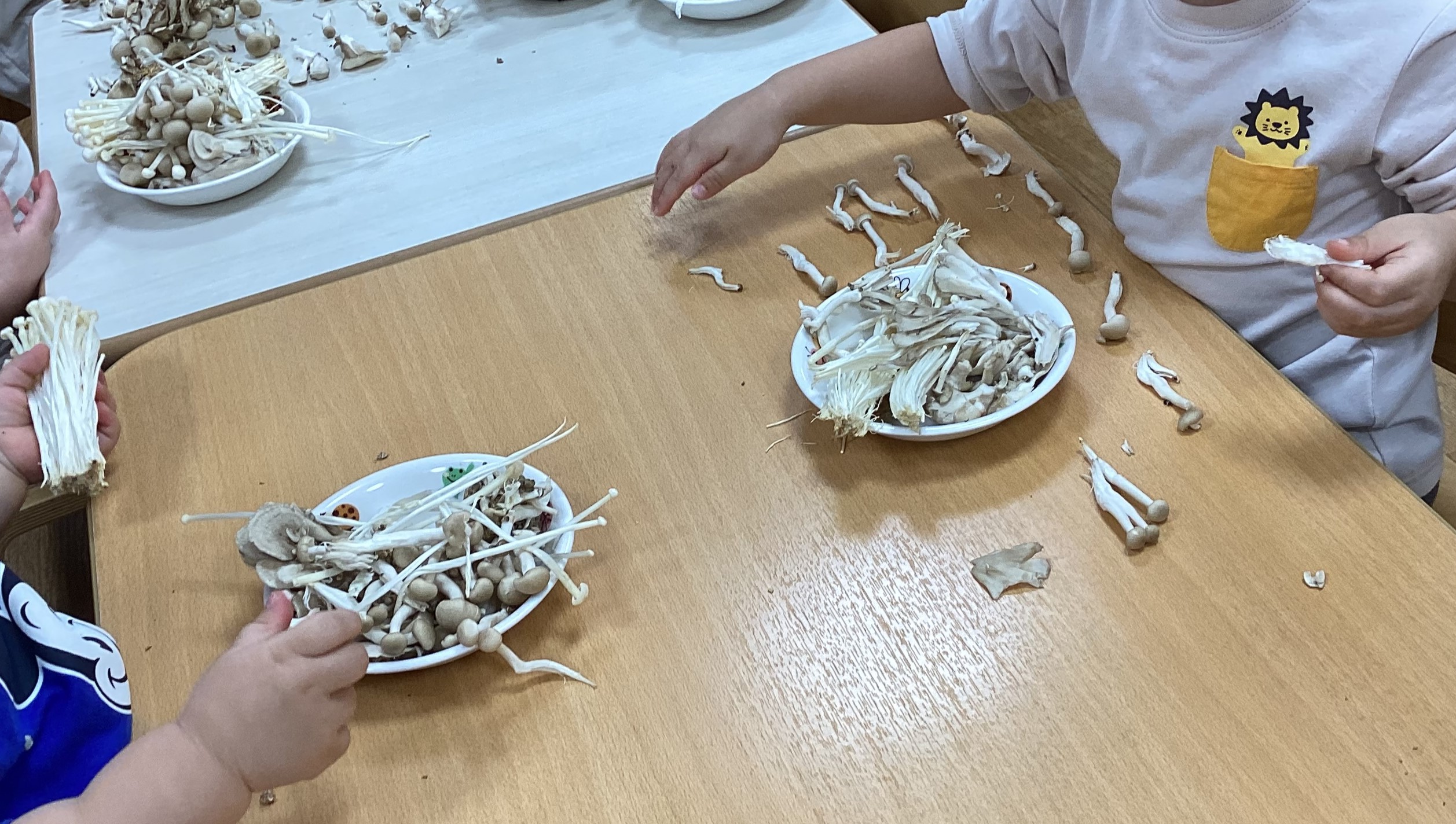 中には触れない子もいましたが、目の前できのこを割いてみると保育者やお友達が触っているところを少し興味があるように見ている様子も見られました☆彡