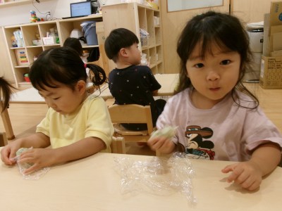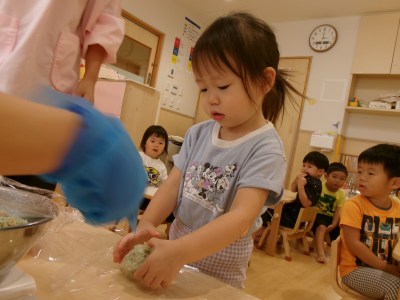 2歳児はお米はどうやって大きくなるのかな~と写真で見た後に