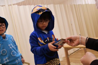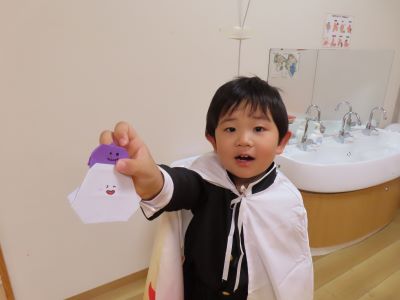 カボチャの折り紙を取って、その後にお菓子をもらいました!!