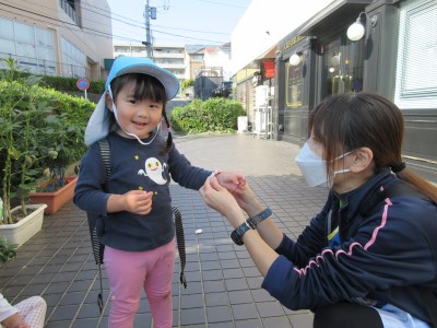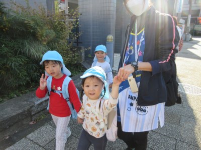 保育園の中で遠足準備をしたら、うさぎ組さんとひよこ組さんに元気に「いってきま~す!」の声かけをして出発進行~♪