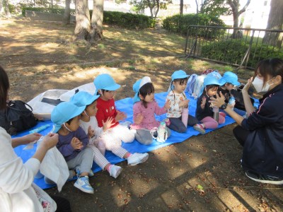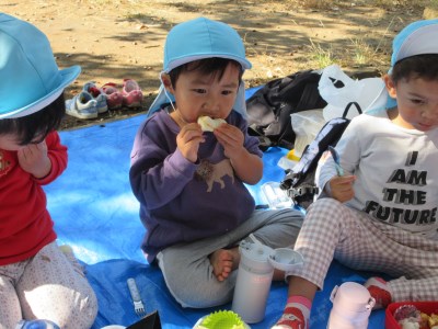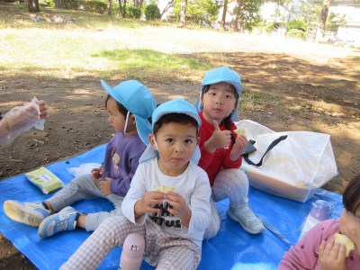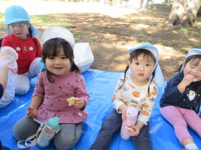 水筒を出して準備をしたら、「ぼーん、ぼーん、ぼーん…♪」と朝おやつの歌を歌って、青空の下で特別感満載な朝おやつをいただきます(*^-^*)