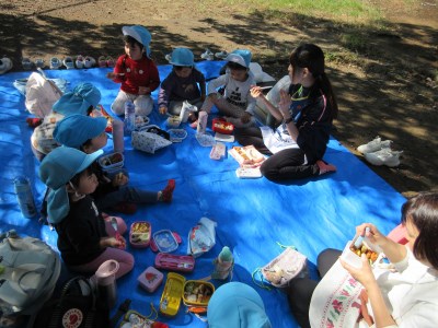 シートの上に荷物を置いて一休みをすると同時に「おべんとう?」とワクワクした様子で聞いてくる子どもたち(^^)早く食べたくて仕方がないようです(笑)