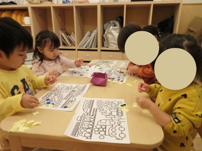 「できたよ」「ここは青のにしたよ」とお友だちと一緒に楽しんでいます。