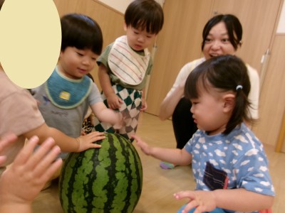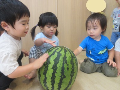 大きなスイカに興味しんしんの乳児さん♬