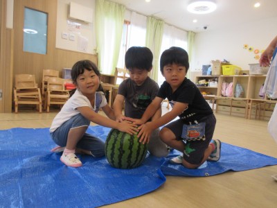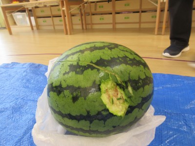 スイカが割れ始めるととってもいいにおいがして、いつ割れるかな?と大盛り上がり♡