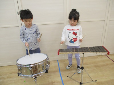 たくさんの種類の楽器に触れ、興味がある楽器を保育者の合図をよく見ながら集中して合奏しています。