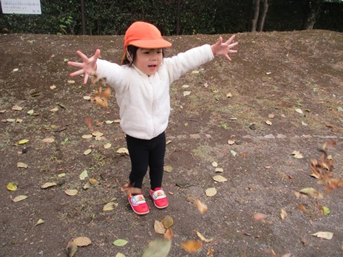 落ち葉を沢山集めて上から散らしたり、足で踏んで音や感触を楽しんでいる子もいました。