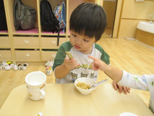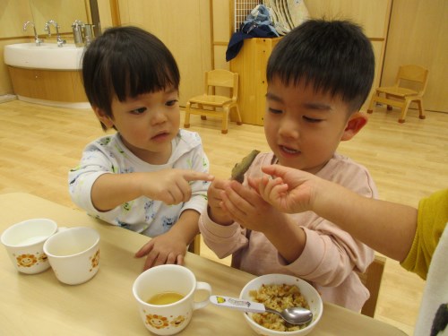 実物のいりこ(煮干し)をみんなに見せると、お魚だ!目がついている!と興味津々に観察していました♪