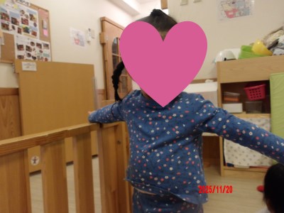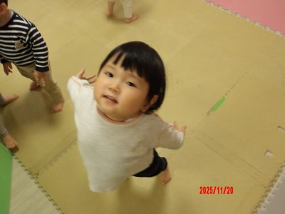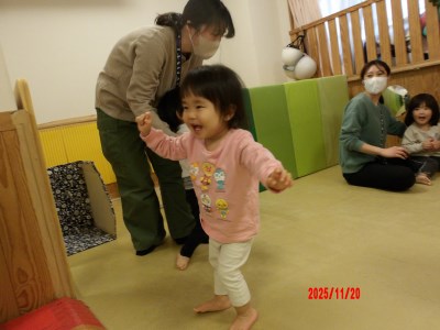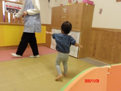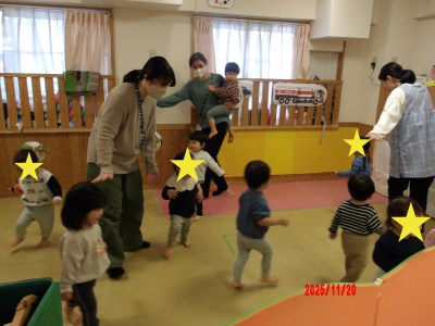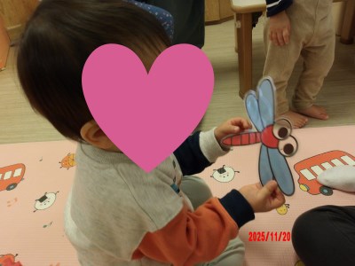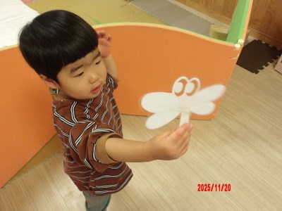 「とんぼのめがね」の曲を弾くと、とんぼになりきり、手を大きく広がながら走ったり、手を上下させたり…たくさんの可愛いとんぼたちが、保育室内を飛び回っていました!