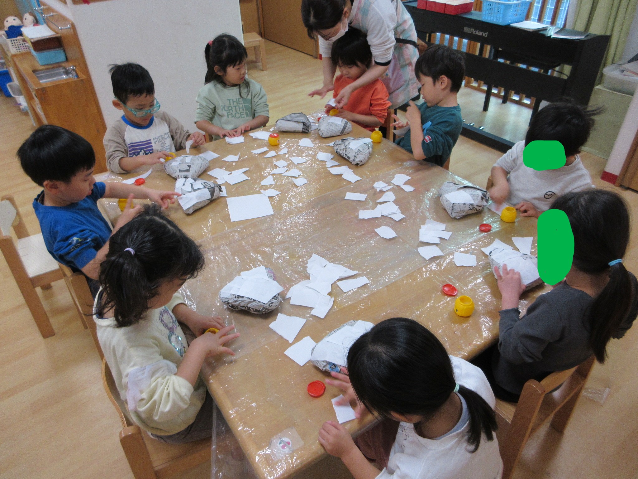 新聞紙を成形した物をベースにして、白い紙を貼り、自分の好きなおにぎりの