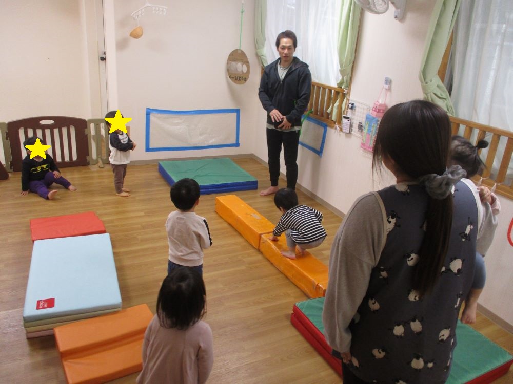 体操教室では一本橋渡りや遊戯など色んな動きを取り入れて遊んでいます。