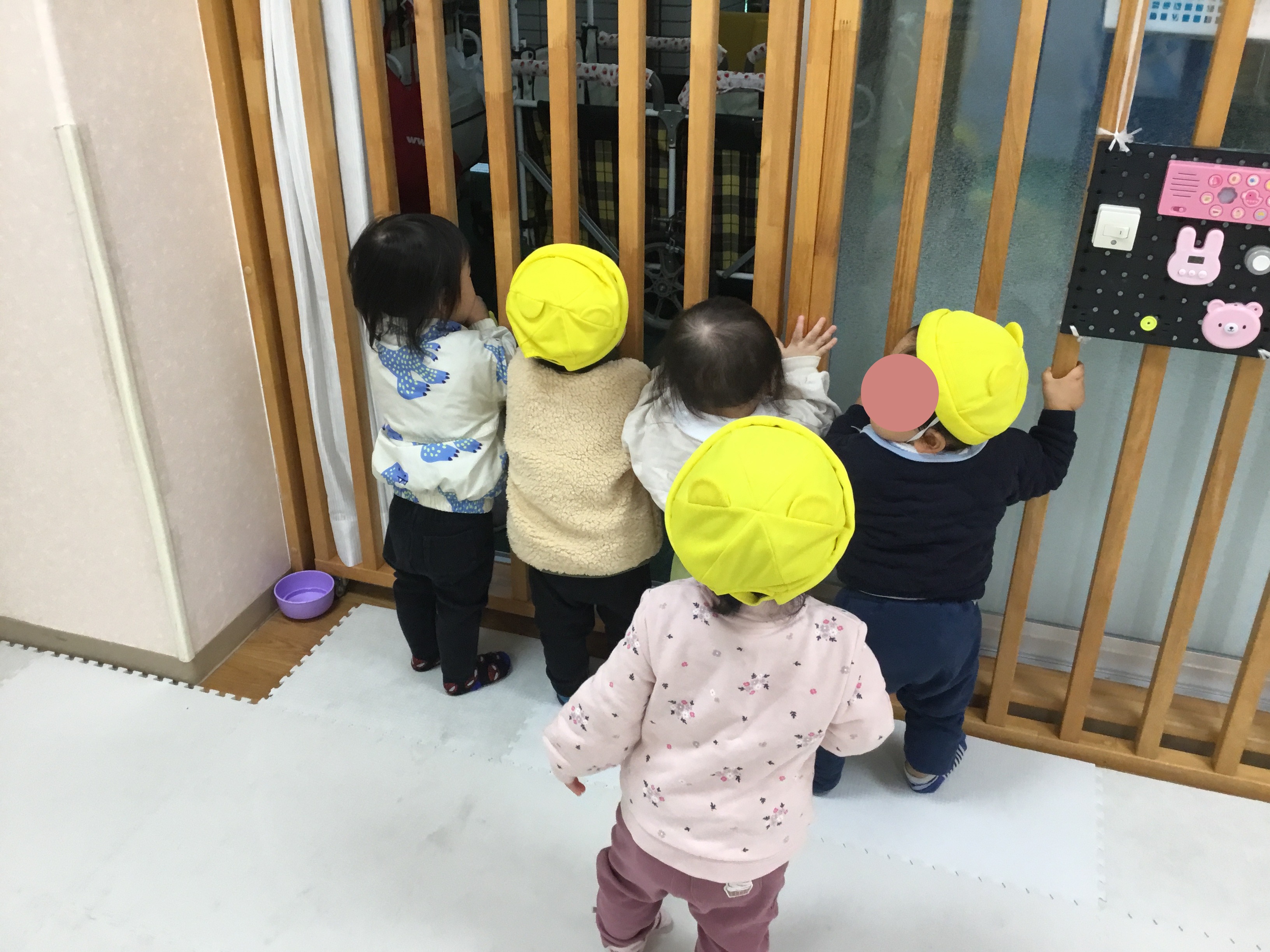 お散歩が大好きなつぼみ組さんは、先生がお散歩準備をしている段階から待ちきれずに