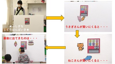 先生からの出し物は、パネルシアターによる『ふしぎなじどうはんばいき』。