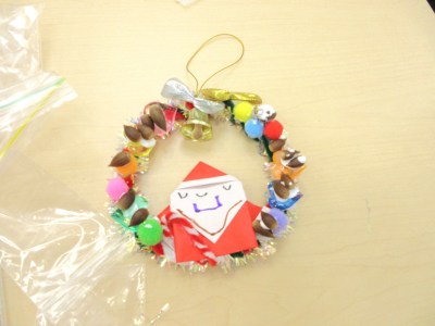 続いて、リース作りへ。モールでキャンディーを作ったり、どんぐりやボンボンなど自由に飾り付け。