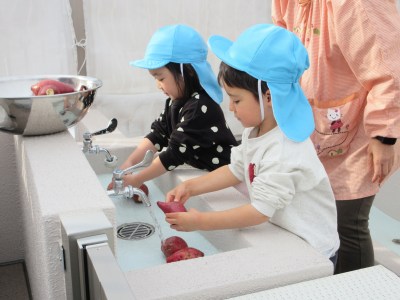 ※「やきいも」をする予定でしたが、当日は朝から風が強く、火を使うのは危険と判断し、「ふかしいもパーティー」に変更しました。