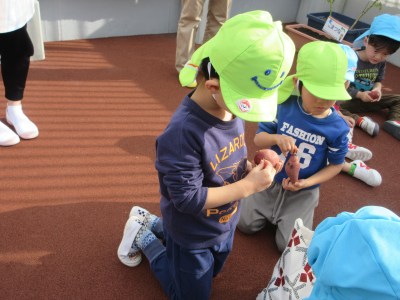 おいもを配ると、感触や形を楽しむ子どもたち。