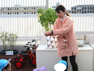 園長先生から「やさしく洗おうね」と、おいもの洗い方を聞きます。