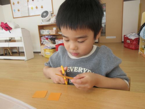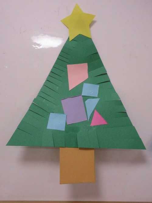 まずは、ツリーの飾りを作りました。ハサミを真っすぐに動かして切ったり斜めに切ってみると、出来た形を見て{煙突に見える!」「三角形になった!」など嬉しそうに話していました。