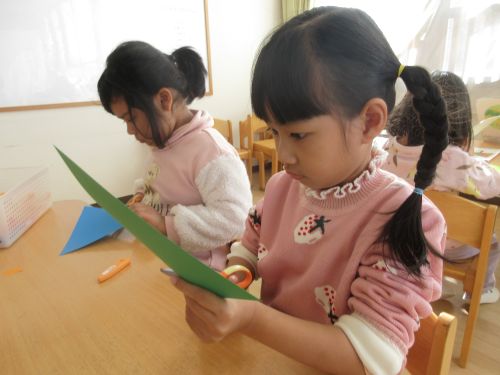 ハサミを使ってクリスマスツリーを作りました。ハサミを使うことを伝えると、{やりたい!」と意欲的な姿が見られ、ハサミの扱い方や持ち方を確認してから行いました。