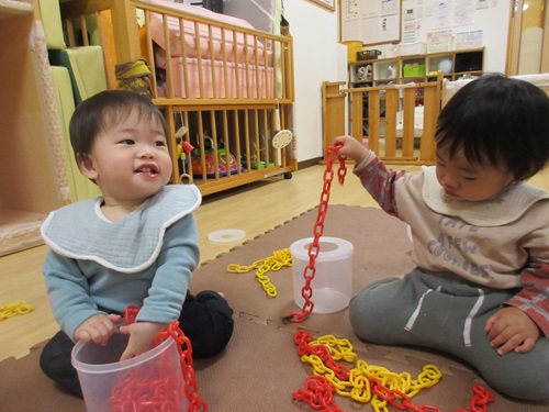 容器に入れたチェーンを、転がしてチェーンの音を鳴らす子もいます。