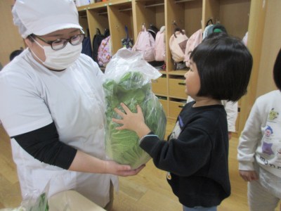 大きな白菜に触ったり、たまねぎやキノコのにおいをかいでみたりと興味津々です。